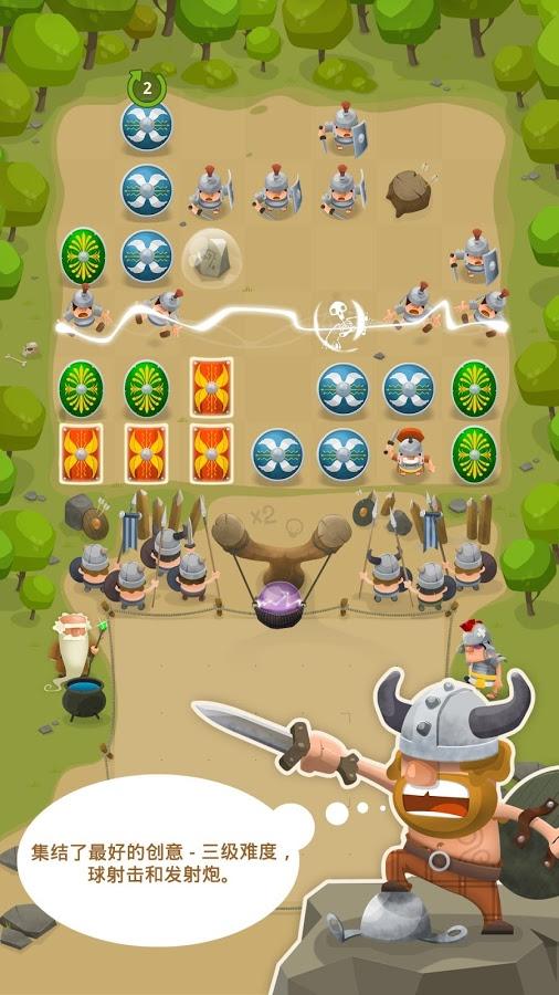 一款画面十分绚丽的塔防游戏游戏中玩家需要通过消除抵抗敌人进攻。本作的游戏方式融合了三消和塔防于一身,玩家在游戏中将化身一名高卢战士,用巨型弹弓来对抗罗马人的侵略。玩家可以用弹弓射击场上的罗马士兵,想与之持有相同的盾牌的士兵消灭。游戏中有各种各样的弹药,每种都有不同的效果,一共有75个关卡等待玩家挑战。
